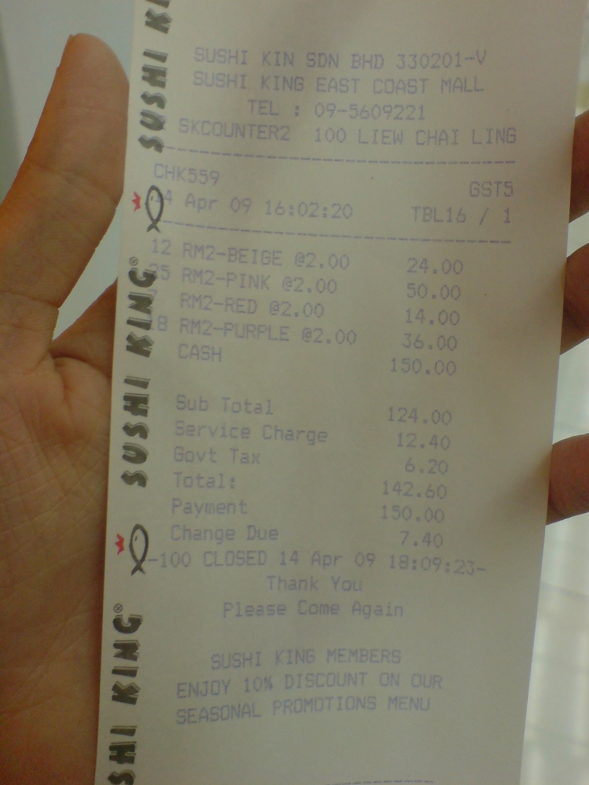 Sushi King having promotion since Monday 13/4/2009 until this tomorrow for member card holders. It cost only RM2/plate. Since I love sushi, this is a must-not-miss chance…. We (me and my classmates) have been planning for this day to come.
