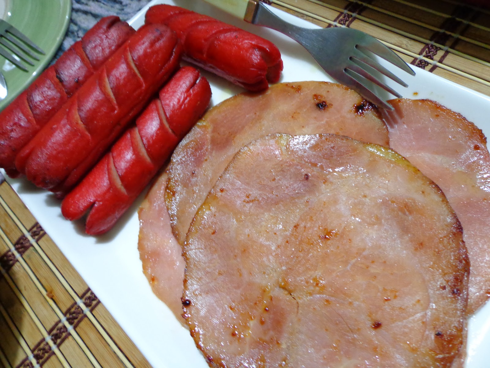 Sausages made from pork, chicken and beef (if not mistaken) and ham! It has been a while since I had any type of ham.