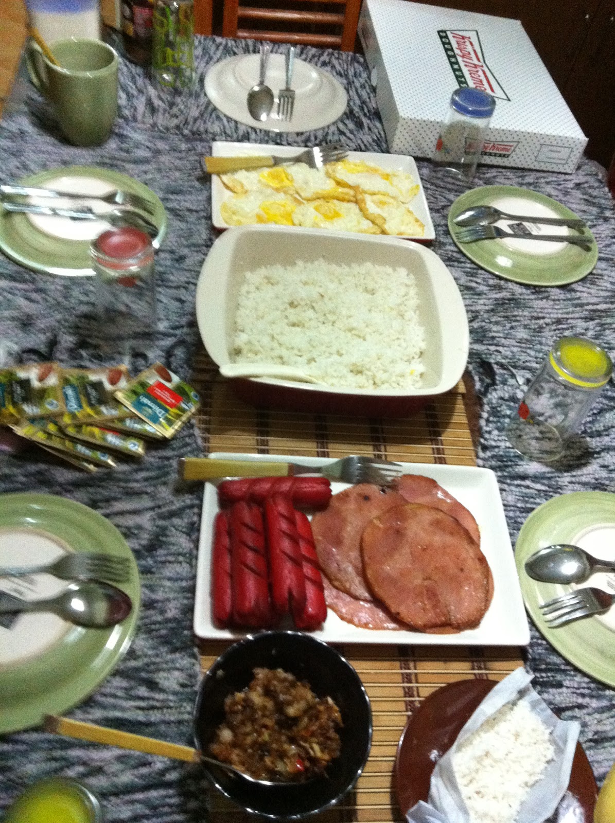 Breakfast laid on the table! How blessed can we get with Krispy Kreme on the side. Americano but not totally.